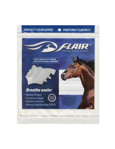 Las tiras FLAIR son tiras nasales autoadhesivas y libres de medicamentos que promueven una salud óptima en los atletas equinos, en todas las disciplinas y niveles de competencia. Las tiras brindan un suave soporte a los tejidos blandos sobre los conductos nasales para reducir la resistencia en las vías respiratorias y mejorar el flujo de aire cuando tu caballo más necesita oxígeno.