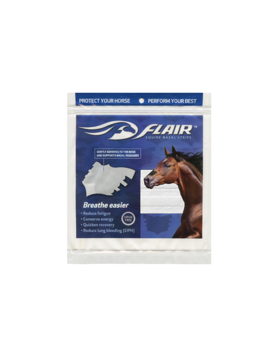 Las tiras FLAIR son tiras nasales autoadhesivas y libres de medicamentos que promueven una salud óptima en los atletas equinos, en todas las disciplinas y niveles de competencia. Las tiras brindan un suave soporte a los tejidos blandos sobre los conductos nasales para reducir la resistencia en las vías respiratorias y mejorar el flujo de aire cuando tu caballo más necesita oxígeno.
