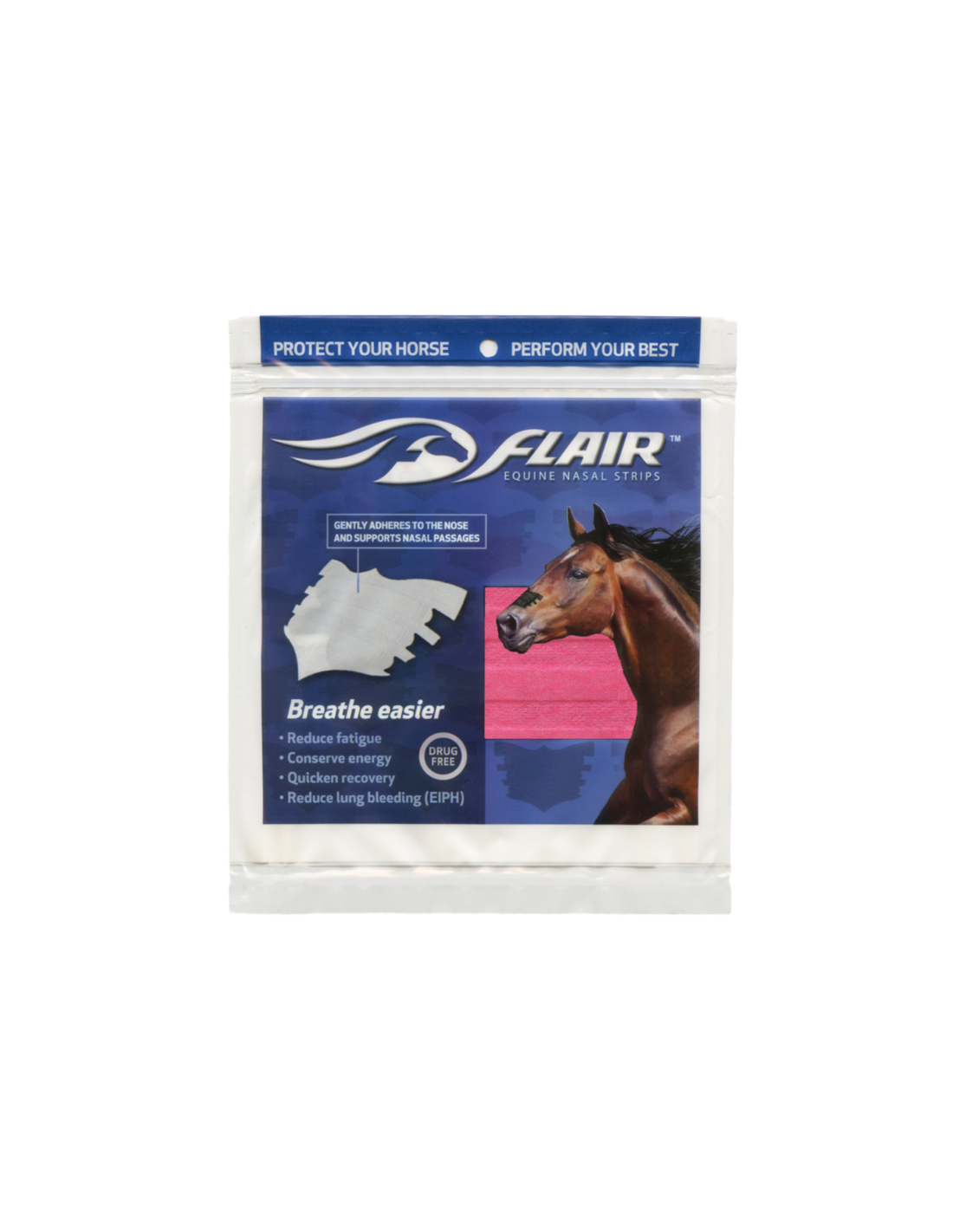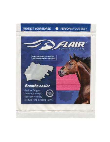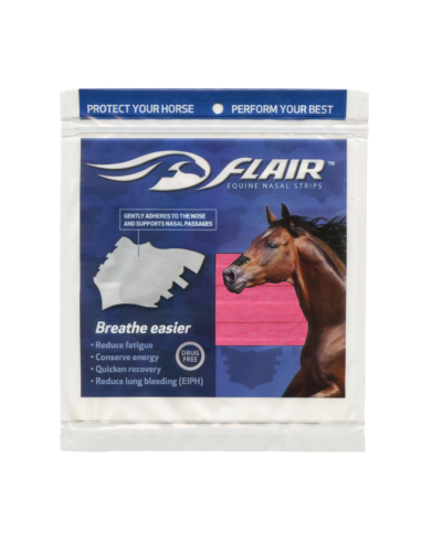 Las tiras FLAIR son tiras nasales autoadhesivas y libres de medicamentos que promueven una salud óptima en los atletas equinos, en todas las disciplinas y niveles de competencia. Las tiras brindan un suave soporte a los tejidos blandos sobre los conductos nasales para reducir la resistencia en las vías respiratorias y mejorar el flujo de aire cuando tu caballo más necesita oxígeno.