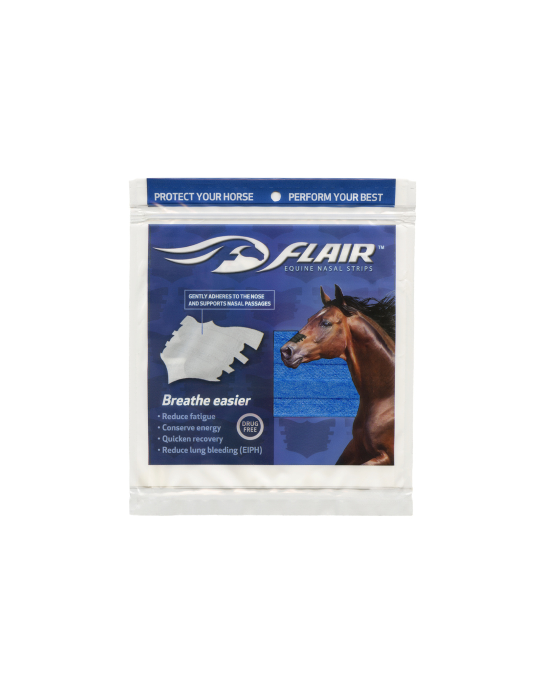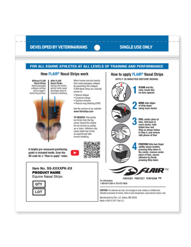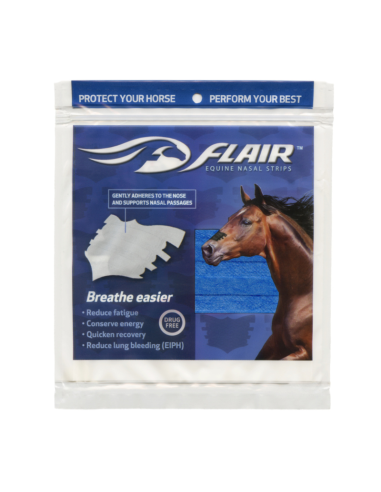 Las tiras FLAIR son tiras nasales autoadhesivas y libres de medicamentos que promueven una salud óptima en los atletas equinos, en todas las disciplinas y niveles de competencia. Las tiras brindan un suave soporte a los tejidos blandos sobre los conductos nasales para reducir la resistencia en las vías respiratorias y mejorar el flujo de aire cuando tu caballo más necesita oxígeno.