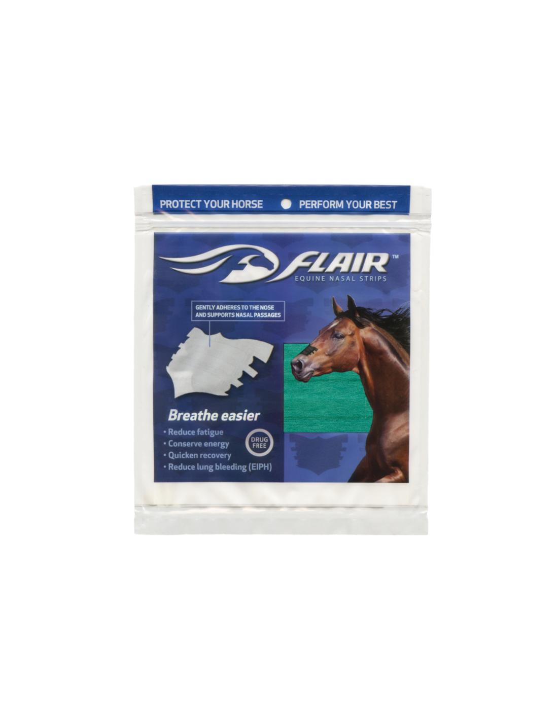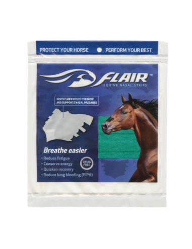 Las tiras FLAIR son tiras nasales autoadhesivas y libres de medicamentos que promueven una salud óptima en los atletas equinos, en todas las disciplinas y niveles de competencia. Las tiras brindan un suave soporte a los tejidos blandos sobre los conductos nasales para reducir la resistencia en las vías respiratorias y mejorar el flujo de aire cuando tu caballo más necesita oxígeno.