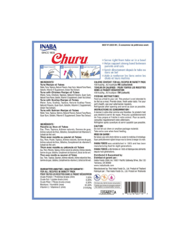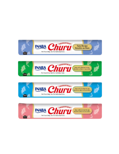 - 5 tubos Churu de atún con pollo: Agua, Atún, Pollo, Tapioca, Saborizantes naturales, Goma Guar, Sabor natural de atún, taurina, Suplemento de vitamina E, Extracto de té verde.