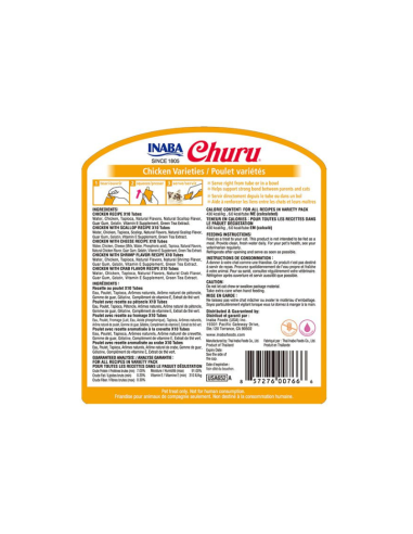 - 10 tubos de Churu de pollo: Agua, pollo, tapioca, sabores naturales, sabor de ostión natural, goma guar, taurina, suplemento de vitamina E, extracto de té verde.