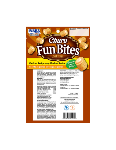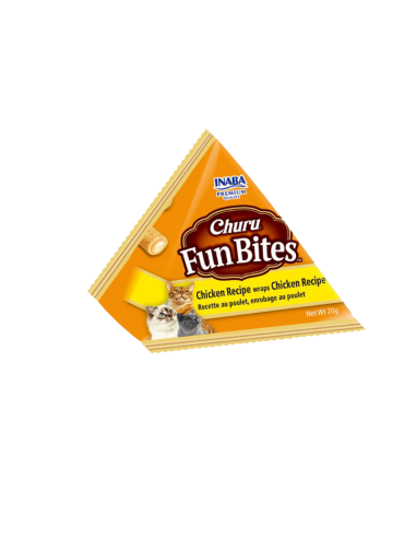 Bocaditos horneados rellenos de crema Churu, elaborados con ingredientes de grado humano. Libre de granos, colorantes y preservantes artificiales. Fortalecido con Vitamina E y té verde.