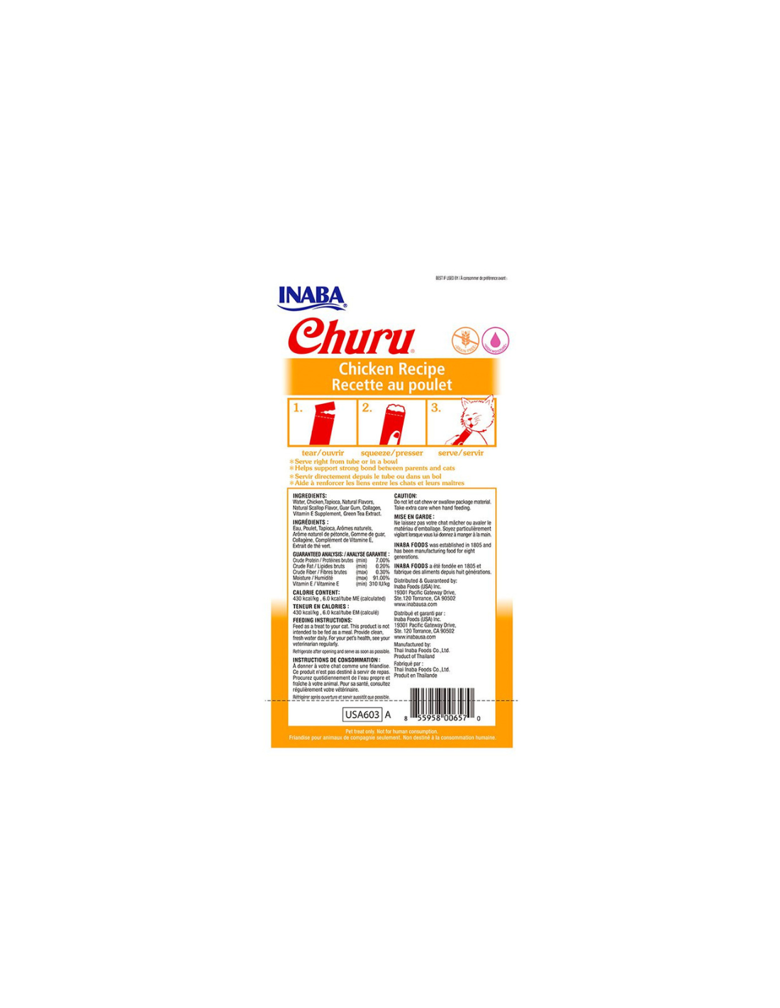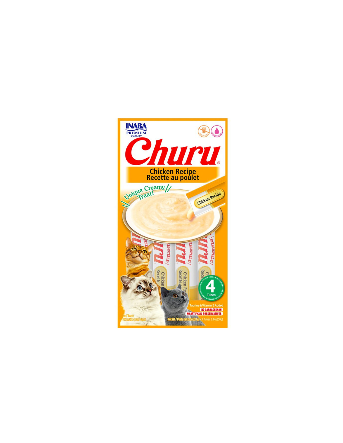 Contenido neto: 14 g x 4 (56 g) Ingredientes: agua, pollo, tapioca, sabores naturales, sabor de ostión natural, goma guar, taurina, suplemento de vitamina E, extracto de té verde.