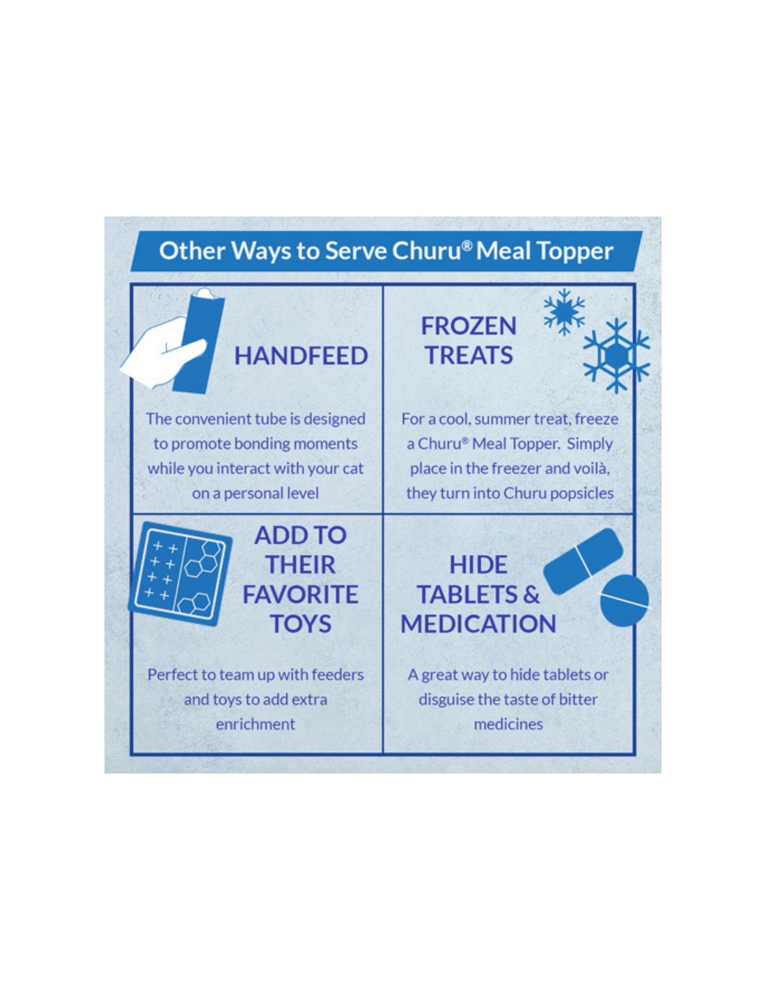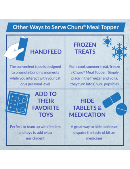 Completamente equilibrada, para ser exactos. Hemos tomado la misma textura cremosa de los premios Churu Lickable Cat Treats que tanto les encanta y la hemos combinado con todas las vitaminas y minerales de un alimento —todo en un práctico tubo de una sola porción.