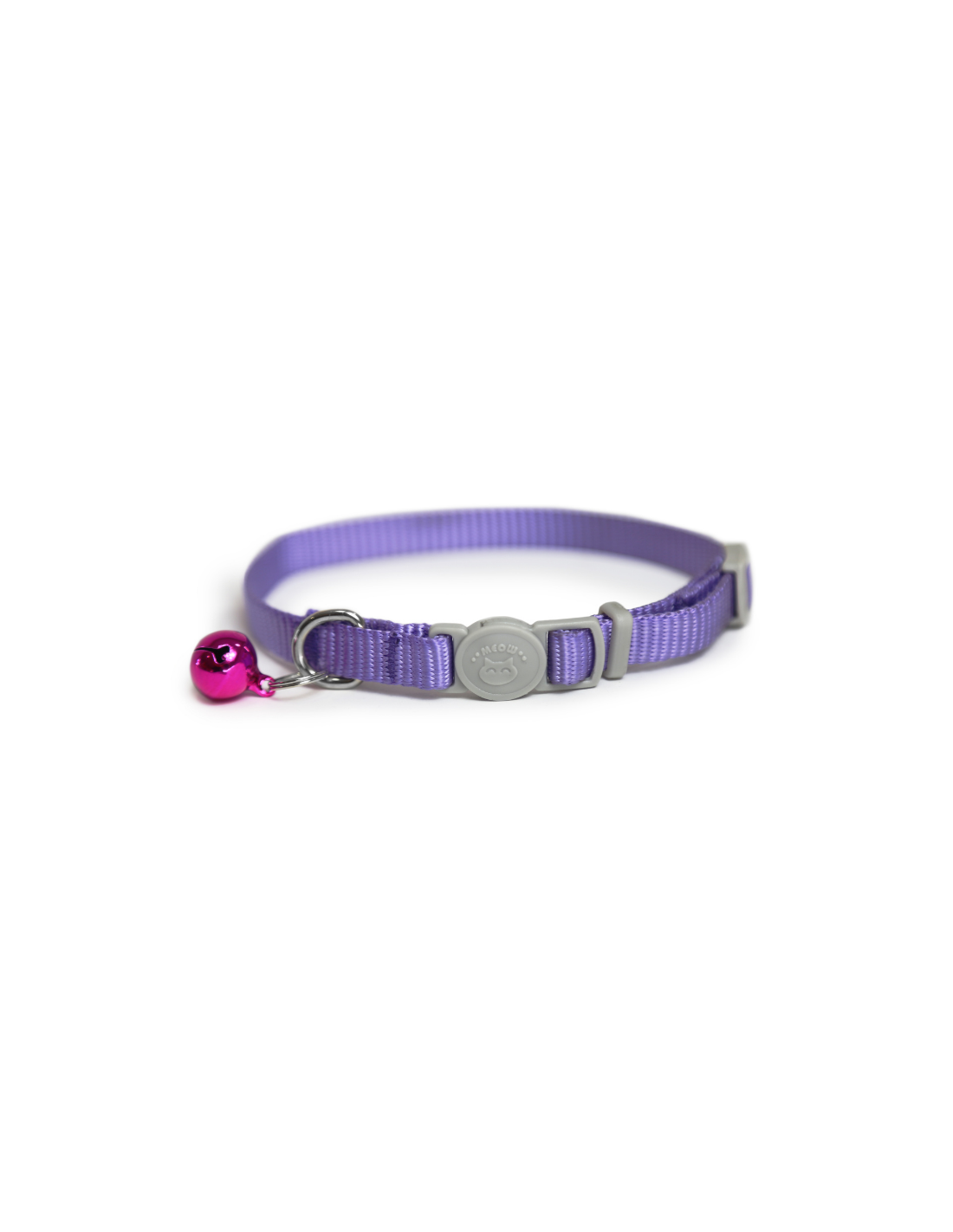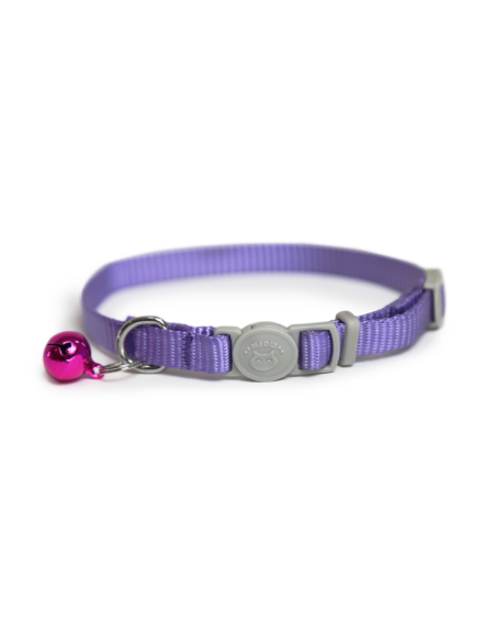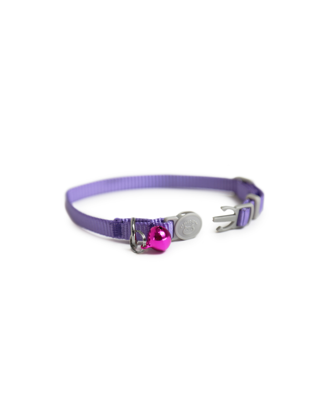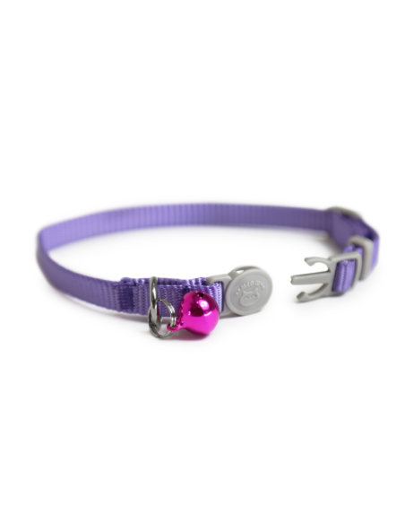 Collar para gato de diseño elegante en color púrpura, ideal para el uso diario. Es ligero y cómodo, pensado para ajustarse fácilmente al cuello del gato.