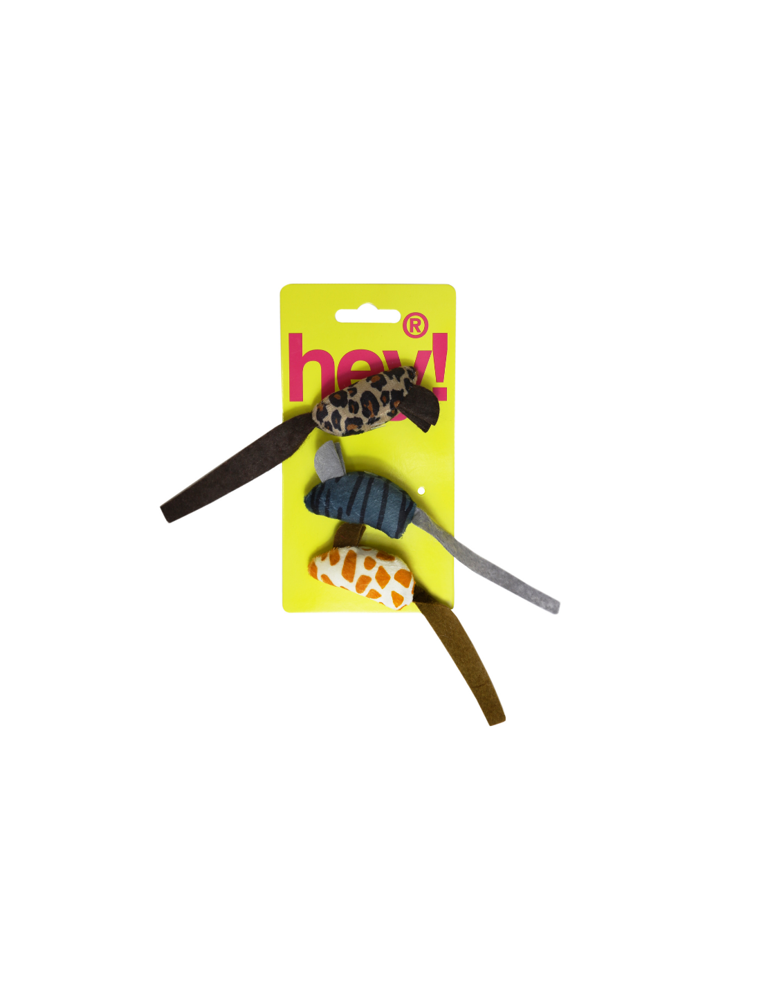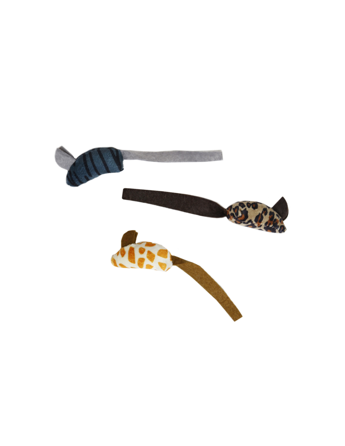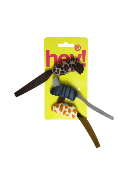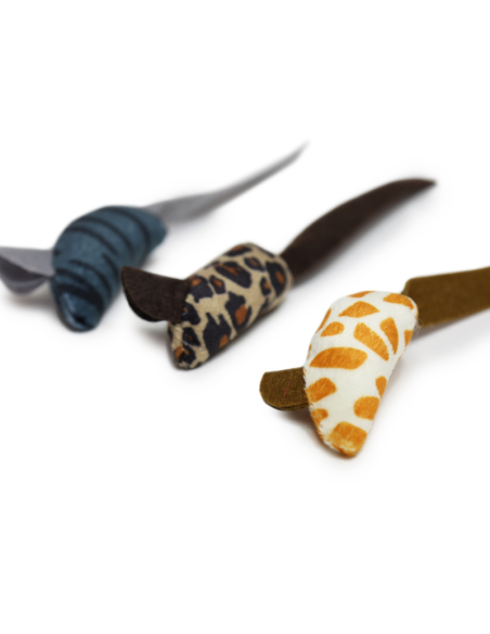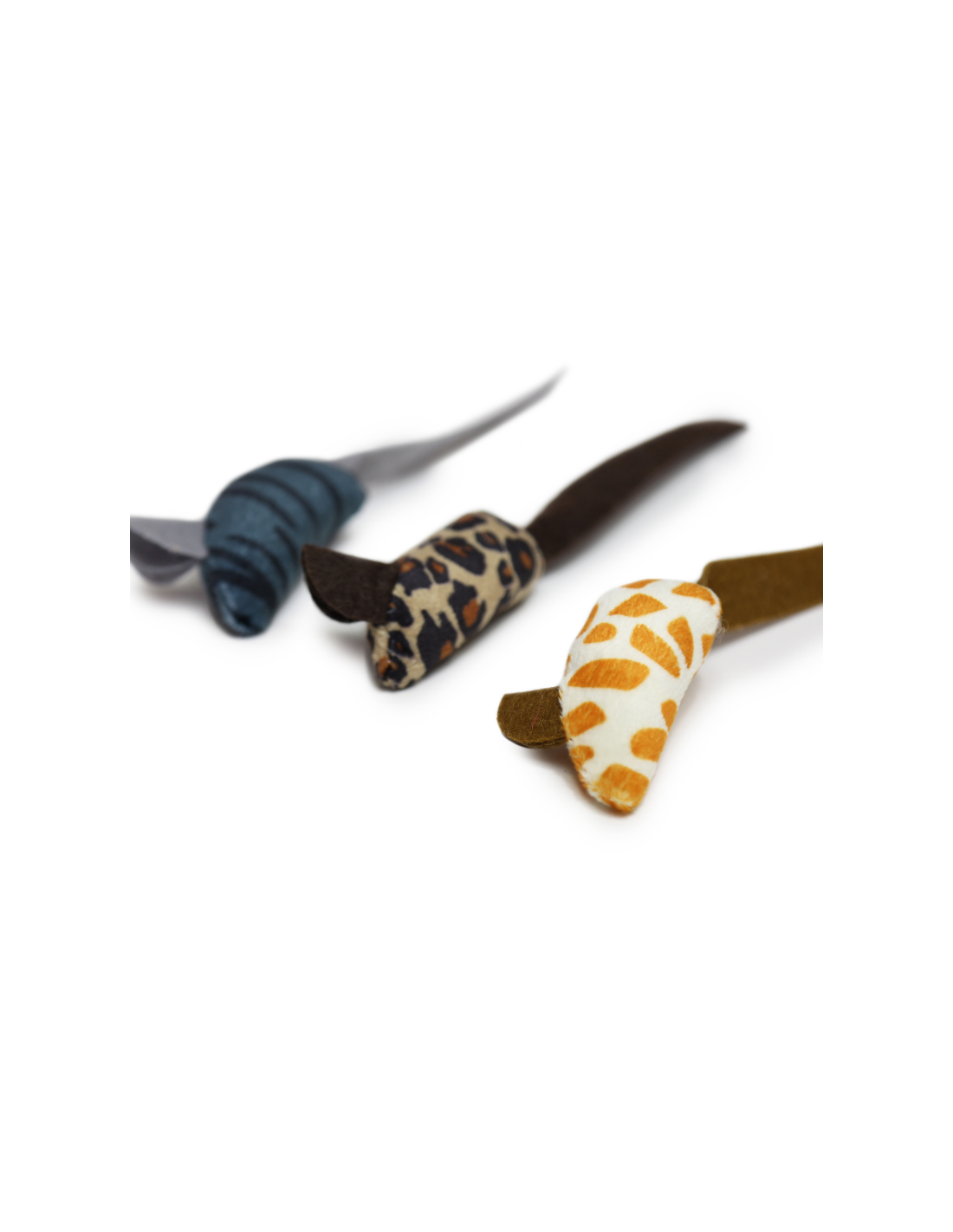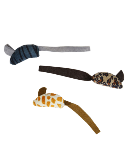 Set de 3 ratones de juguete diseñados para estimular el instinto natural de caza de los gatos. Cada ratón está fabricado con tela suave y presenta diferentes diseños y colores que llaman la atención durante el juego.