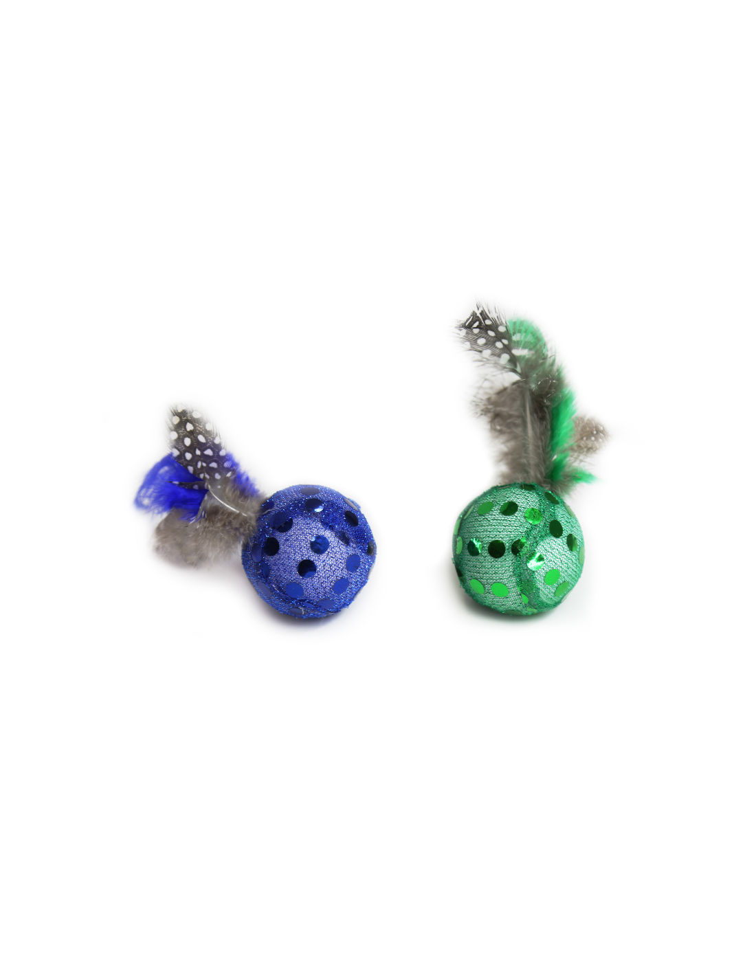 Set de 2 pelotas de juguete diseñadas para estimular el instinto natural de caza de los gatos. Cada pelota está cubierta con tela texturizada, lo que genera una superficie atractiva para que el gato la muerda, la persiga y la manipule durante el juego.