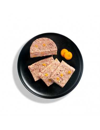 Carne, corazón, hígado y mollejas de pollo (40 %); carne y corazón de pato (25 %); caldo de carne de pollo y pato (24,5 %); mijo, cocido (4 %); zanahorias (4 %); semillas de chía (1 %); cáscaras de huevo, secas (0,5 %); minerales (0,5 %); aceite de cardo (0,5 %).
