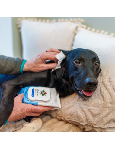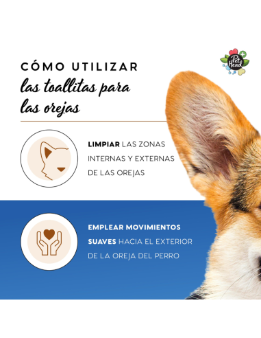 Limpie las áreas internas y externas del oído con movimientos suaves. Use una toallita fresca para cada oído. Adecuado para uso diario. Solo para uso tópico. Adecuado para todos los perros mayores de 12 semanas.