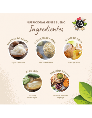 Todos los productos de Pet Head están libres de sustancias nocivas: sin parabenos, tensioactivos ni colorantes. No contienen gluten ni frutos secos para mayor seguridad. Todos los ingredientes están completamente listados en nuestros envases. Pet Head se enorgullece de ser vegano y de estar libre de crueldad.
