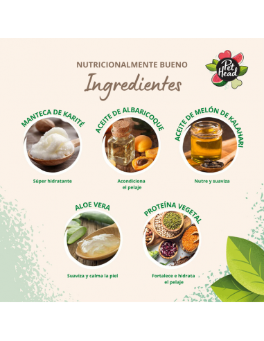 Todos los productos de Pet Head están libres de sustancias nocivas: sin parabenos, tensioactivos ni colorantes. No contienen gluten ni frutos secos para mayor seguridad. Todos los ingredientes están completamente listados en nuestros envases. Pet Head se enorgullece de ser vegano y de estar libre de crueldad.