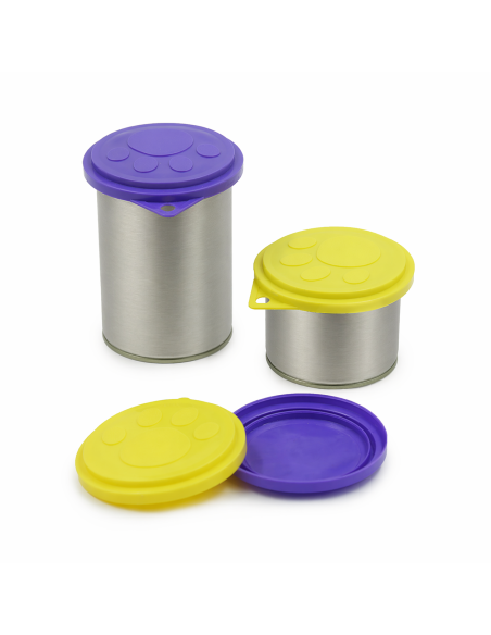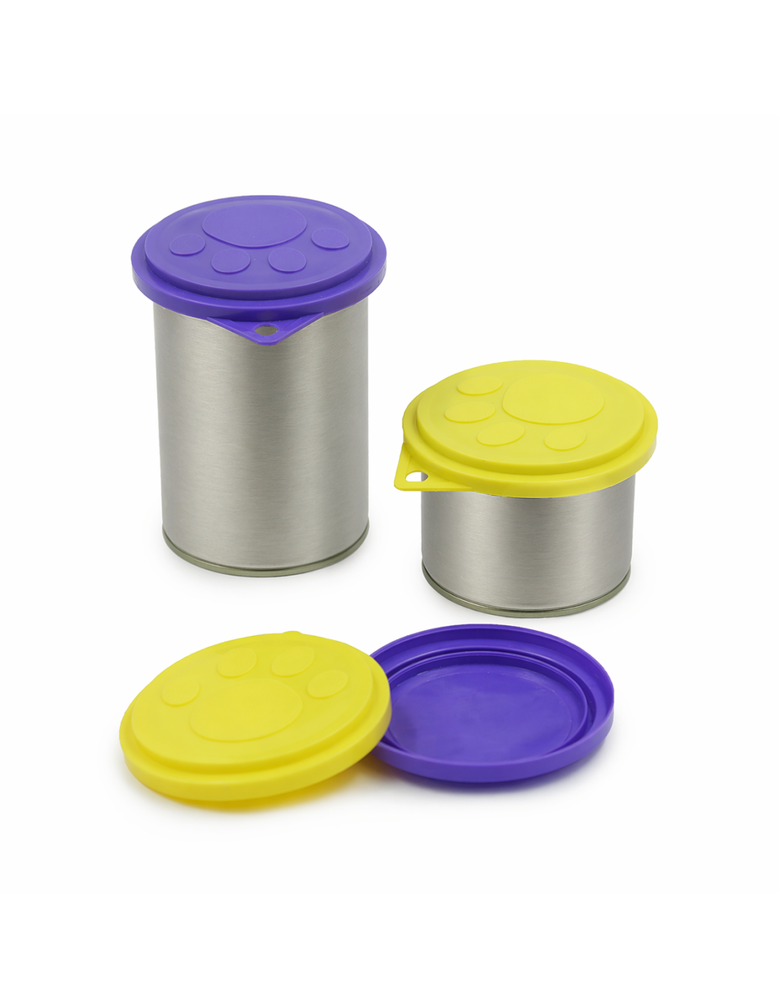 La tapa para latas de comida de hey! para mascotas esta hecha de plástico de color amarillo. Estas tapas de latas ayudan a mantener las latas de comida para mascotas frescas por más tiempo.