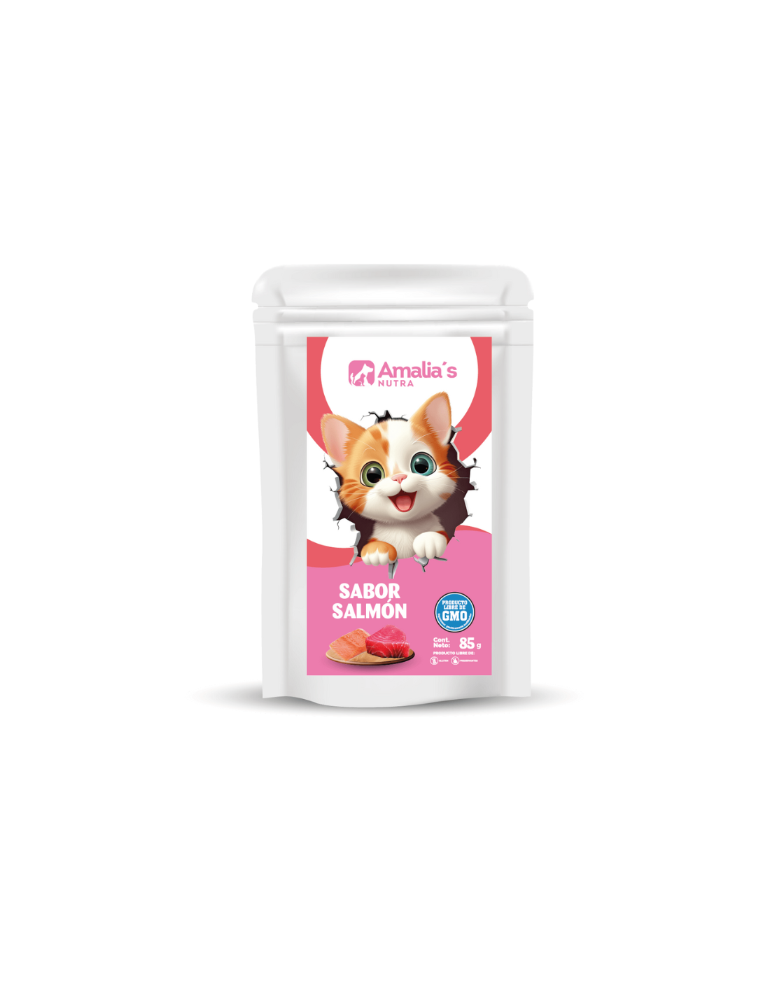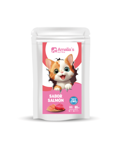 Pescado (Atun - Thunnus albacares o Mahi Mahi - Coryphaena hippurus) 50%, Agua suficiente para el proceso 38%, Proteína de Soya 10%, Goma Guar (espesante) 1% y Mix de vitaminas y minerales 0.5% y Saborizante Salmón 0.5%.