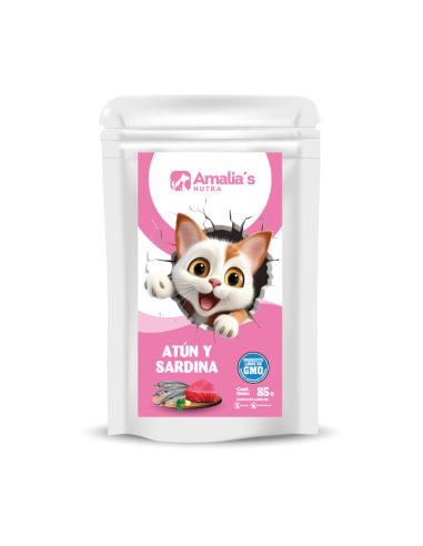 Pescado (Atún - Thunnus albacares o Mahi Mahi - Coryphaena hippurus) 40%, Agua suficiente para el proceso 35%, Sardina (Ophithonema libertate) 17,5%, Proteína de Soya 5%, Goma Guar (espesante) 1,0% y Mix de vitaminas y minerales 1,0% y Saborizante Salmón 0.5%.