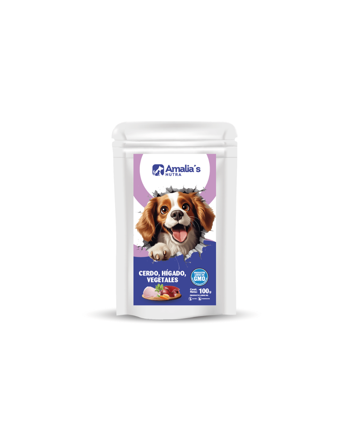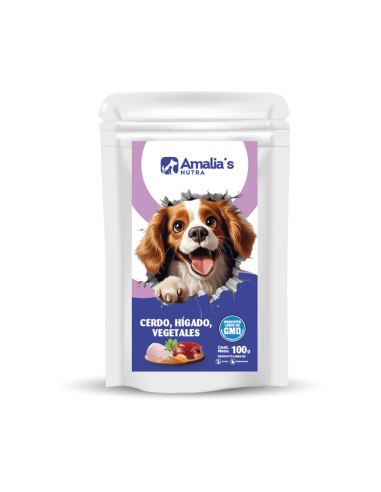 Hígado de Cerdo 40%, Agua suficiente para el proceso 32%, Carne de Cerdo (Sus Scrota domesticus) 11%,Remolacha 5%, Zanahoria 3%, Caldo vegetal 3%, Almidon de Yuca 3%, Mix de vitaminas y minerales 1,0%, Aceite vegetal 0,5%, Goma Guar (espesante) 1,0%, Levadura 0,45%, Sabor a tocino ahumado 0,05%.