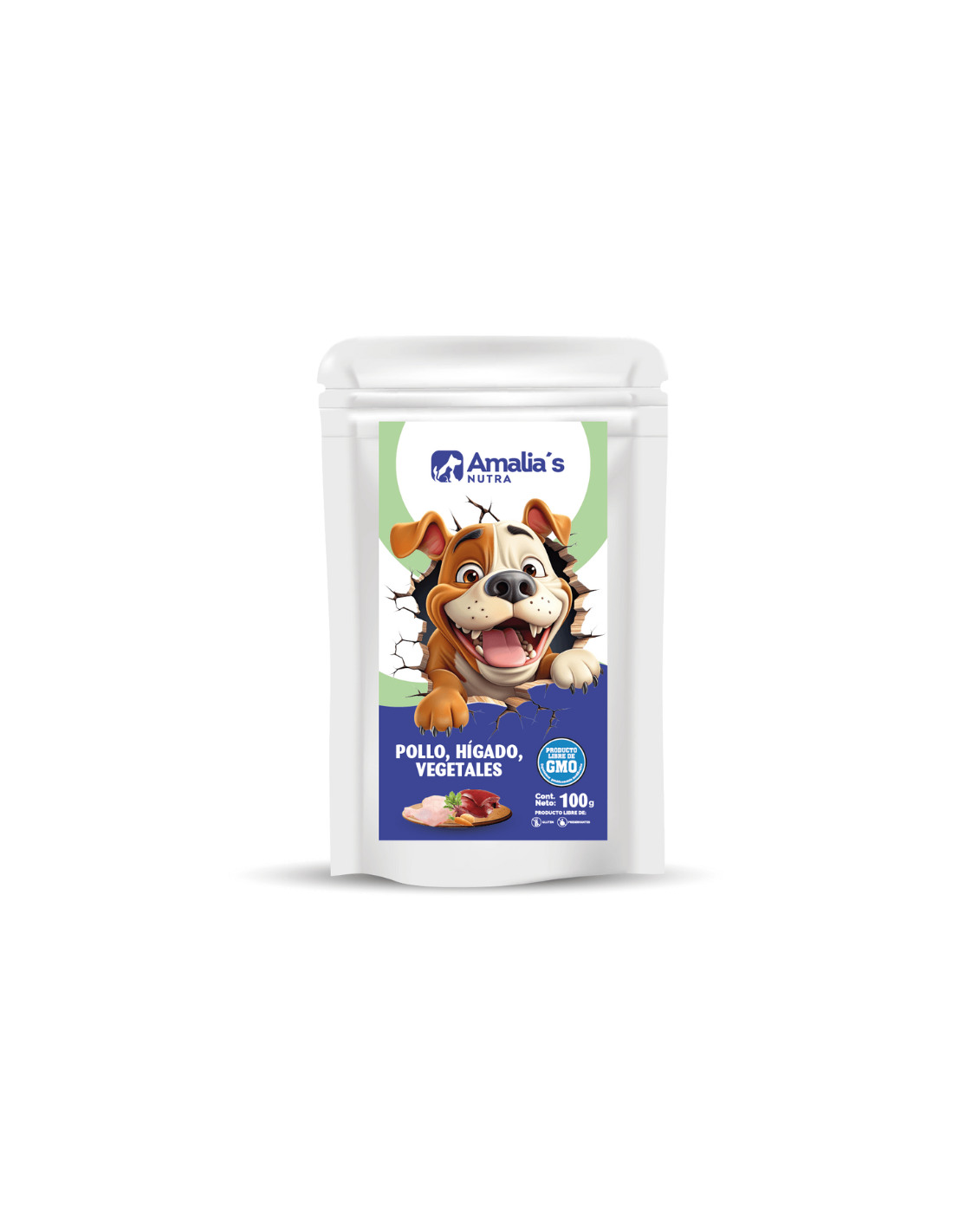 Pollo vísceras 35%, Agua suficiente para el proceso 34%, Carne de Pollo (Gallus gallus domesticus) 18%, Calabaza 5%, Arveja 2%, Caldo vegetal 2%, Suero de Leche 1.0%, Aceite vegetal 1,0%, Goma Guar (espesante) 1,0% y Mix de vitaminas y minerales 1,0%.