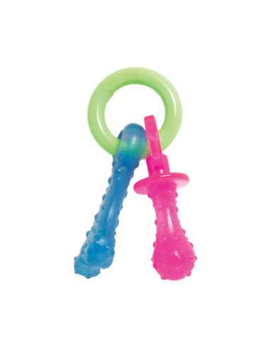 Este juguete de dentición cuenta con 2 chupetes en un anillo para mantener a su nuevo masticador entretenido y feliz. El material más blando es suave para los dientes del cachorro, mientras que las protuberancias masajean las encías para aliviar aún más la dentición. Este juguete está especialmente diseñado para la dentición de cachorros, no para cachorros poderosos o perros con sus dientes adultos. Con este chupete para perros enseñará a su nuevo mejor amigo hábitos saludables para toda la vida.