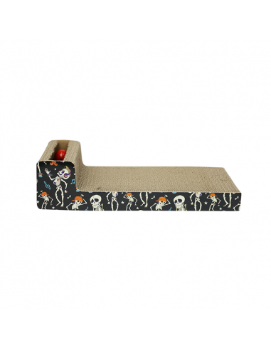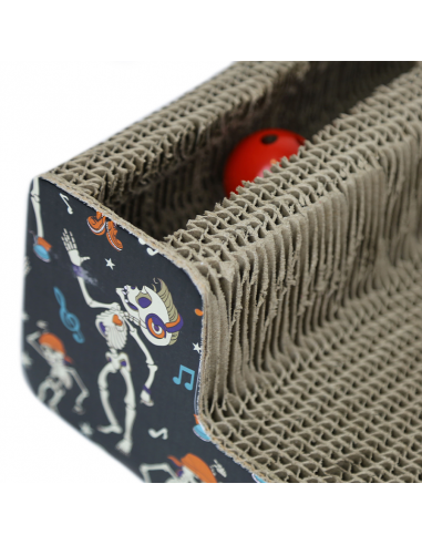 Deja que tu amigo felino se una a las festividades con este rascador de juguete para gatos de Hey!. Este rascador, está decorado con un diseño único y divertido de calaveras. Está hecho con materiales reciclados, viene con una pelota sonora y hierba gatera para mayor emoción.
