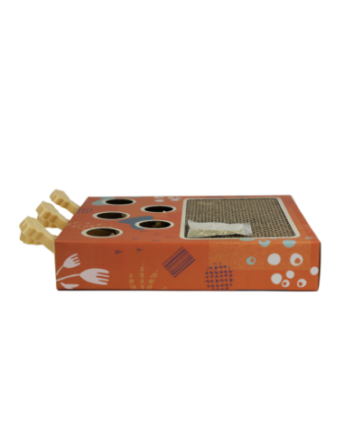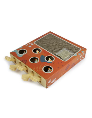 Este rascador para gatos incluye hierba gatera para mantener entretenido a los gatos con su diseño de caja interactiva con agujeros en la parte superior, la cual al apretar las patitas, se asoma un ratoncito.