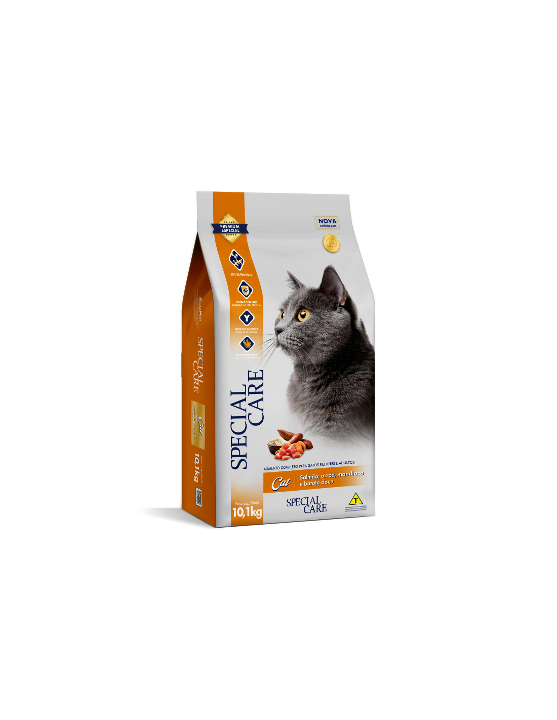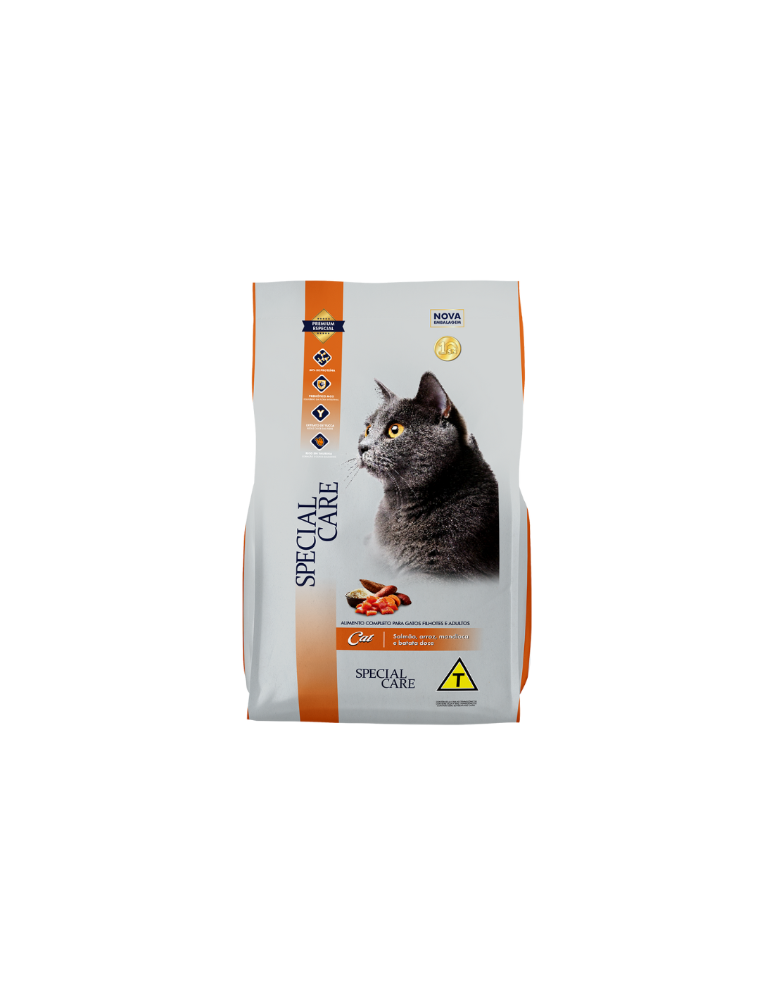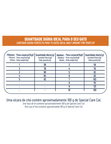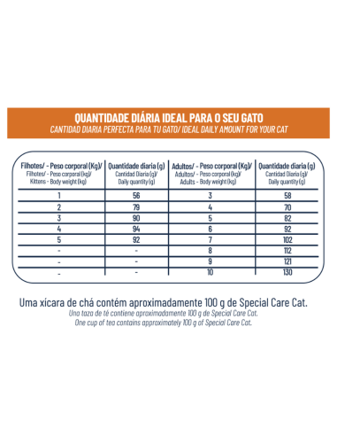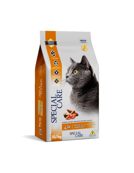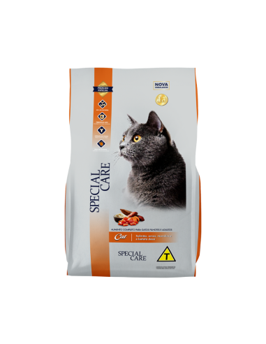 SPECIAL CARE CAT es un alimento completo para gatos cachorros y adultos. Formulado con ingredientes de alta calidad y balanceado para cubrir las necesidades nutricionales de los felinos, altamente palatable, ofrece un sabor irresistible y cuidados especiales del tracto urinario. Contiene prebióticos que mejoran la absorción de nutrientes, polifosfato para una mejor salud dental, omegas 3 y 6 para una piel saludable y pelaje brillante, yucca que reduce el olor de las heces y está enriquecido con minerales orgánicos para más salud y vitalidad.