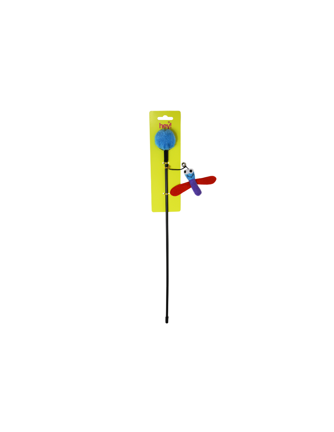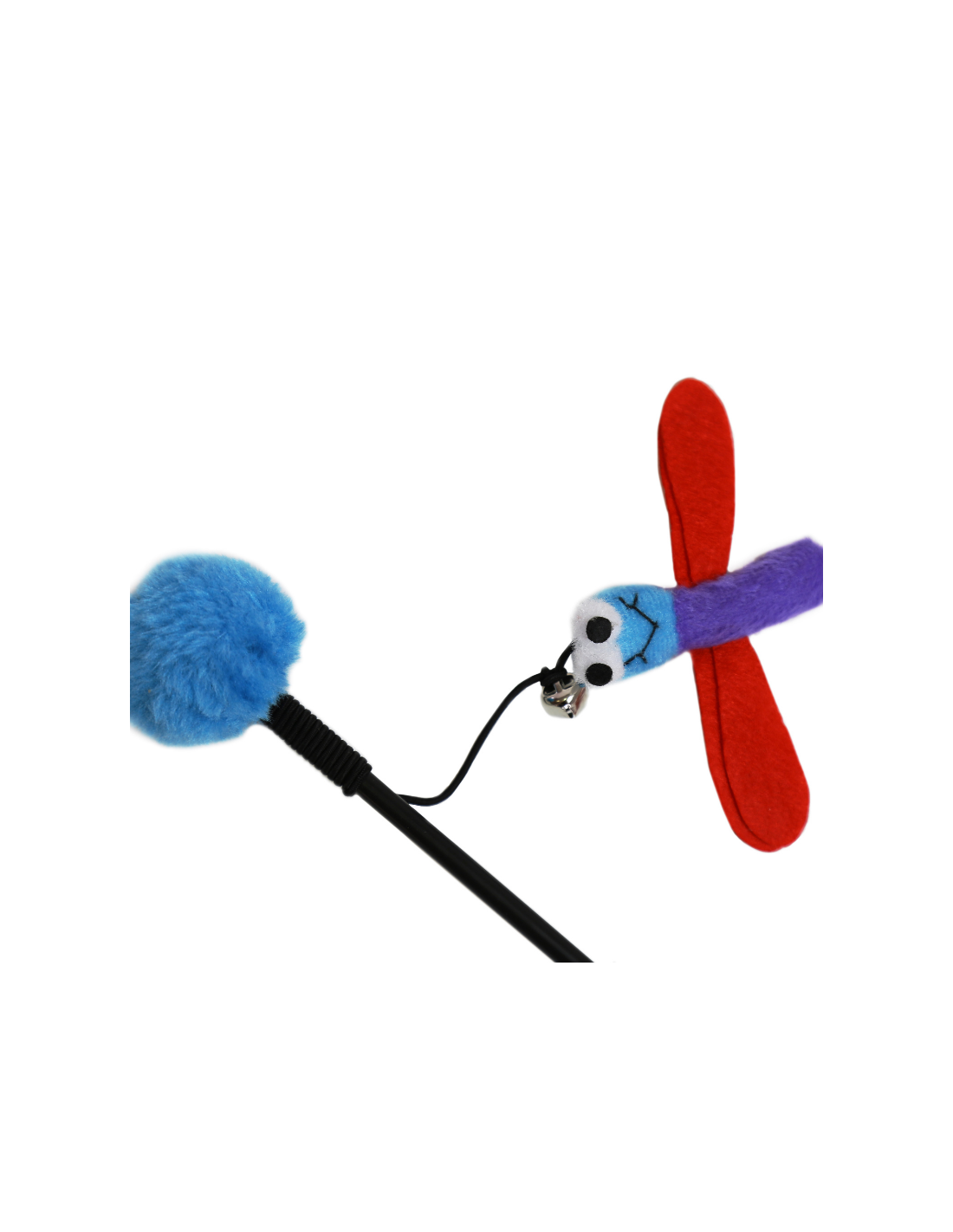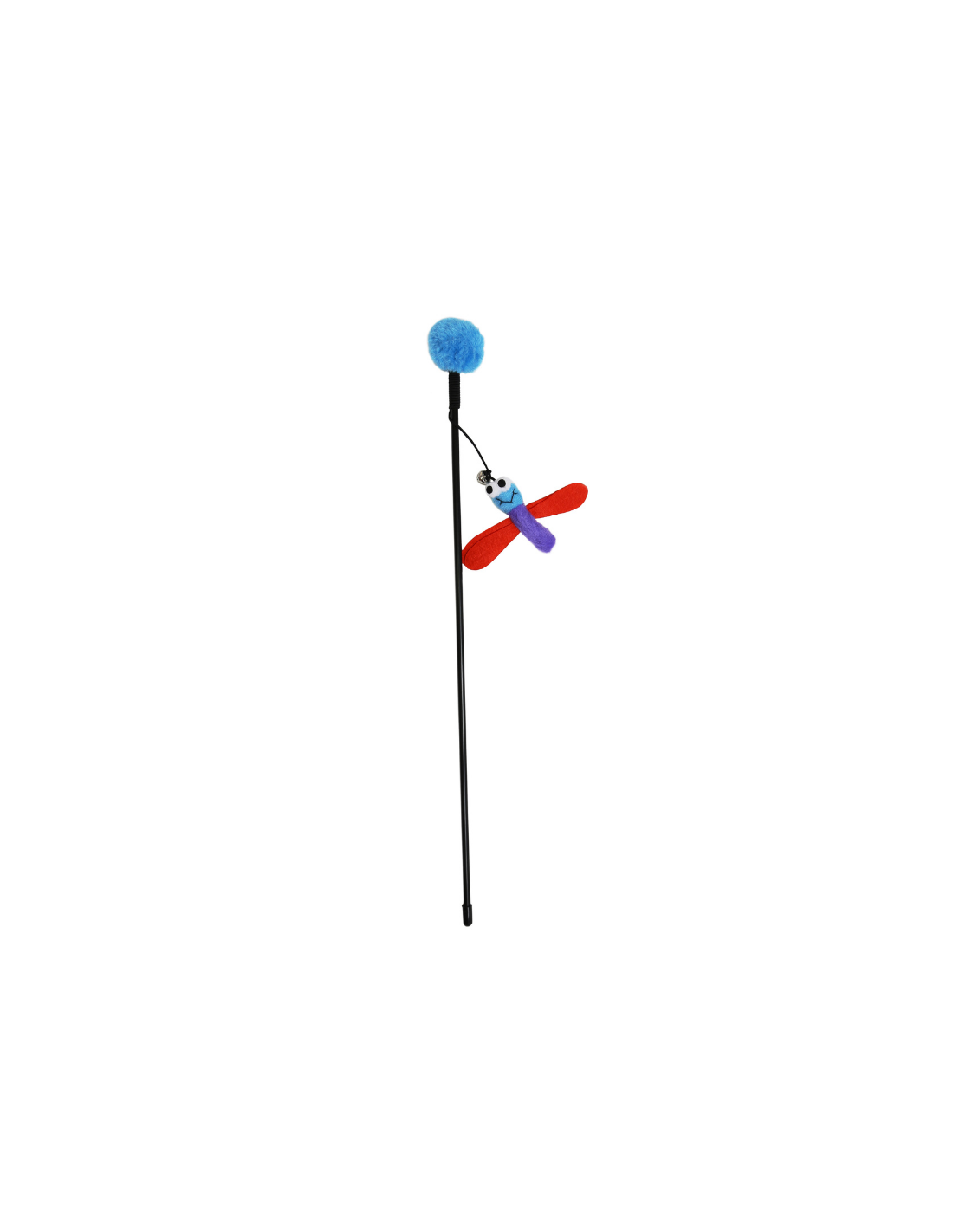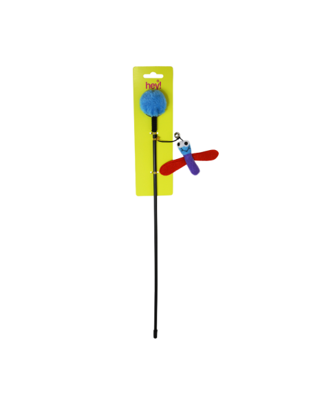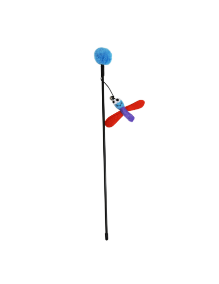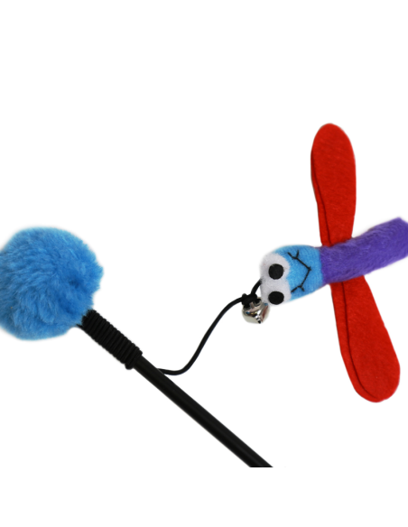 Juguete interactivo tipo varilla diseñado para estimular el instinto natural de caza de los gatos. Cuenta con una varilla larga que permite mover el juguete fácilmente, mientras que la figura colgante con forma de libélula y alas llamativas genera movimiento que atrae la atención del gato.
